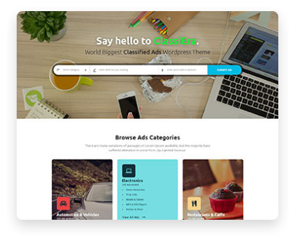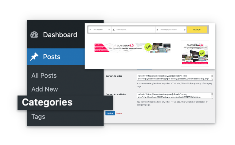 Classiera have too many advance options and custom ads is one of them . It’s unique in own way . You can add IMAGE ADS HTML ADS, GOOGLE ADS etc with placement like top and sidebar
